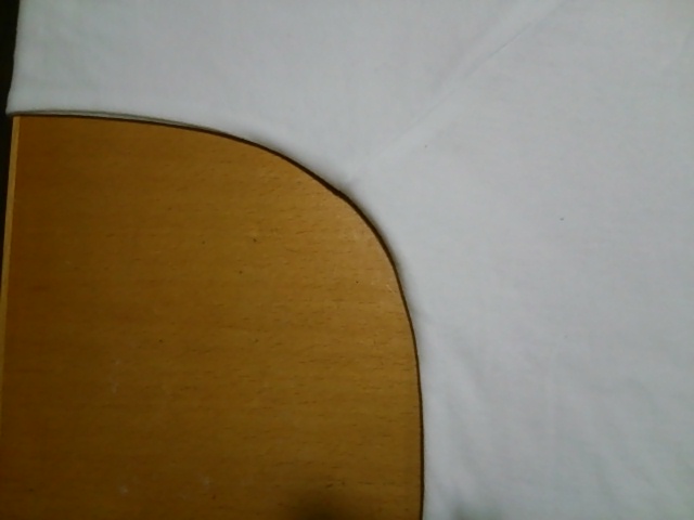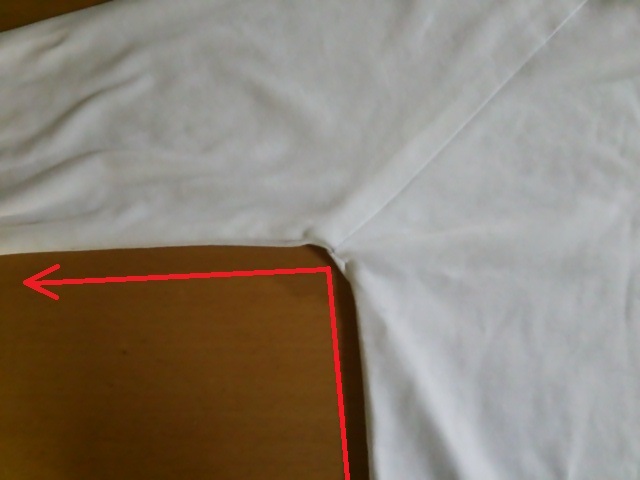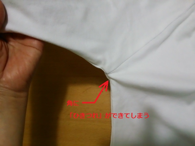 | ところが、脇の鋭角を直線で縫うと、「ひきつれ」ができてしまいました。 こういう場合、縫い代をできるだけ細くすると解決したりもするんですが、今回は脇とそで下の線が作る角度が結構鋭角なため、縫い代が5mmにしてもこの問題は解決しませんでした。 |