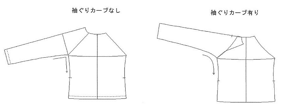 | これは、パタンナーさんから送られてきた説明図です。 今回は、ラグランスリーブの袖ぐりを直線でお願いしました。 すると、左側の図のように、脇の下に鋭角の角度がついてしまいます。 それに大して、通常のカーブのある袖口だと、右側のように、脇の下も自然とゆるいカーブになります。 |