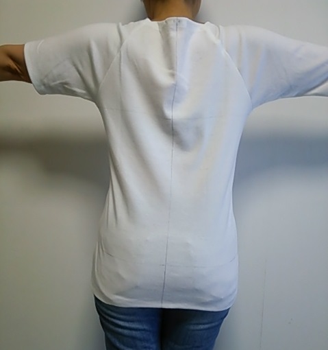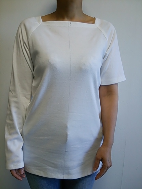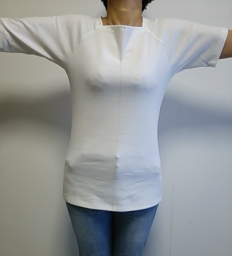 | 袖と身頃を合わせてみると、縫い合わせる線はぴったり。 曲線部分も同じなので、縫い合わせる難易度は前回と同じですね。 ということで、この型紙で作った新しいトワル(試作)を着てみました。 |