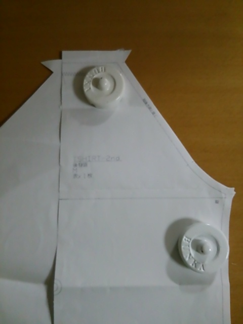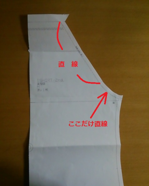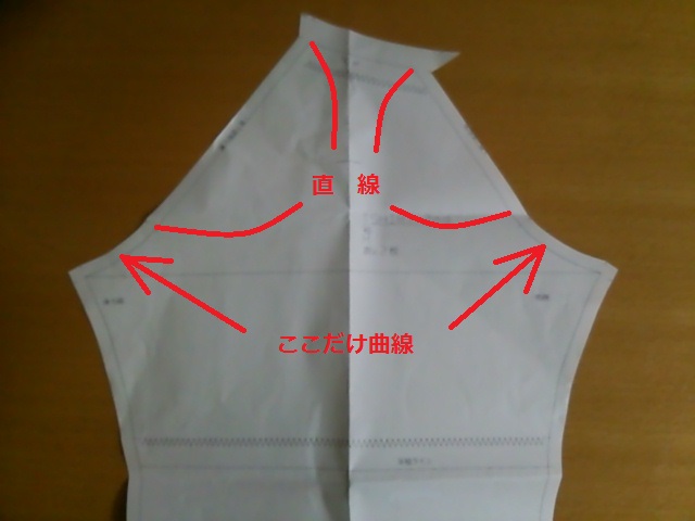 | で、送られてきたパターンがこちら。 これは袖のパーツです。 ご覧のように、身頃と縫い合わせる部分はほとんどが直線。 脇の下の部分だけに曲線が入っています。 右側の斜辺を前身頃、左側の斜辺を後ろ身頃と縫い合わせます。 |